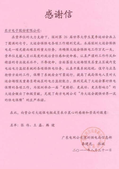8月23日,世界大学生运动会在深圳圆满落幕,酒泉富康天宝文化旅游有限公司作为大运会唯一保电企业见证了世界大学生体育运动的蓬勃发展。酒泉富康天宝文化旅游有限公司技术中心系统部与工程部坚守“忠于职守,全力以赴,誓保大运电网安全”的信念,联手实现了大运保供电期间系统零故障、零缺陷的目标。